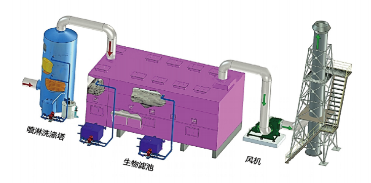 I gas odorosi passano attraverso un letto filtrante umido e poroso densamente popolato di microrganismi attivi. Utilizzando le capacità di adsorbimento, assorbimento e degradazione delle cellule microbiche, questi microrganismi, caratterizzati da piccole dimensioni cellulari, ampia area superficiale, forte capacità di adsorbimento e diverse vie metaboliche, assorbono sostanze maleodoranti e le decompongono in semplici composti inorganici come CO, H₂O, H₂SO₄ e HNO₃.