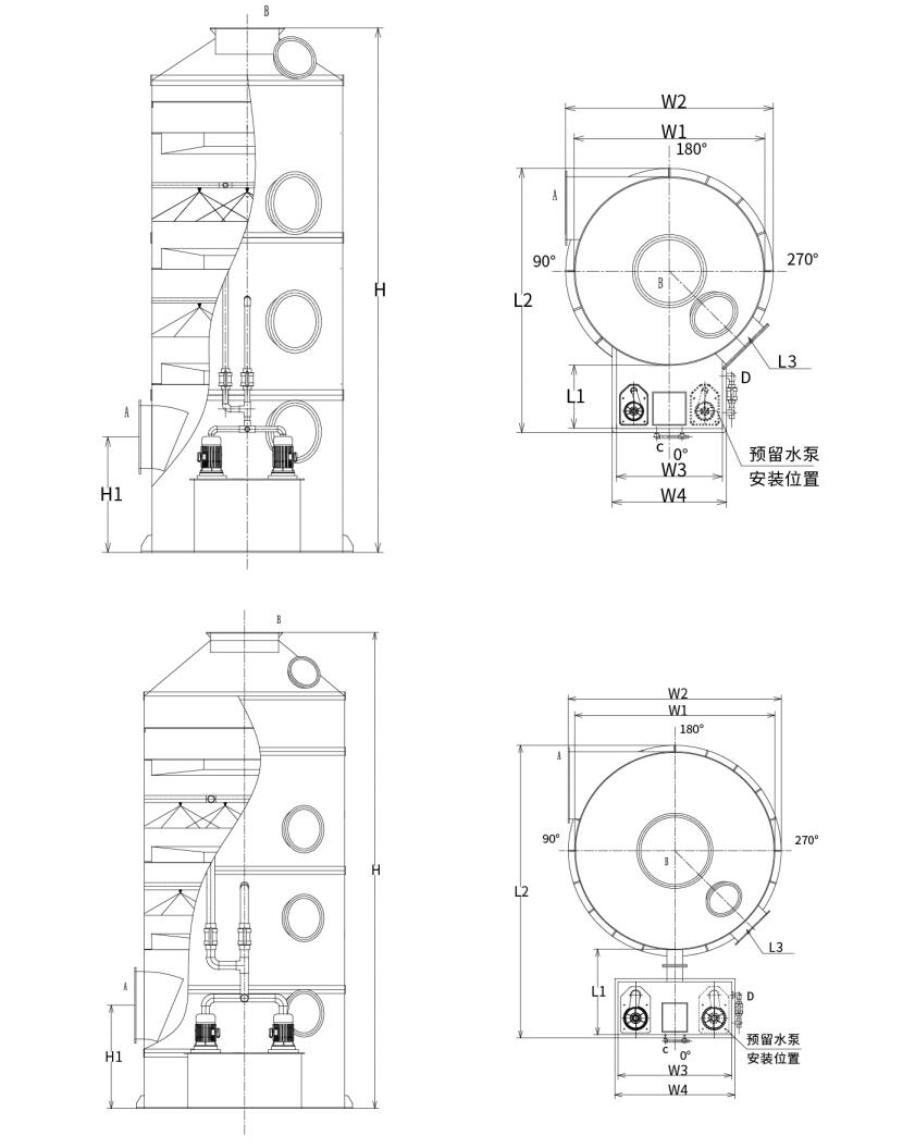 Tipo 2: Scrubber ciclonico con serbatoio dell'acqua di tipo diviso (diametro della torre: Φ2500mm-Φ3500mm)